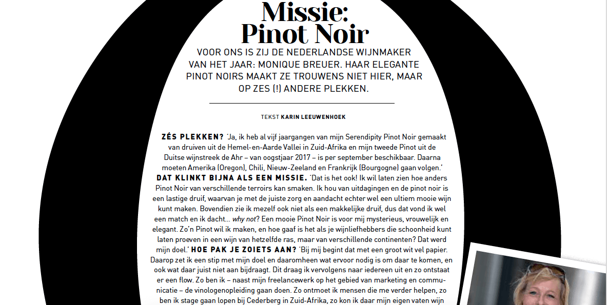 ZÉS PLEKKEN? ‘Ja, ik heb al vijf jaargangen van mijn Serendipity Pinot Noir gemaakt van druiven uit de Hemel-en-Aarde Vallei in Zuid-Afrika en mijn tweede Pinot uit de Duitse wijnstreek de Ahr, van oogstjaar 2017, is per september beschikbaar. Daarna moeten Amerika (Oregon), Chili, Nieuw-Zeeland en Frankrijk (Bourgogne) gaan volgen.’ DAT KLINKT BIJNA ALS EEN MISSIE. ‘Dat is het ook!… LEES MEER….